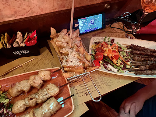 The environment is great being on the main walking strip in the area - lots of life! Inside there are many things to look at: from the ceiling there hangs different currencies/money bills from around the world, many different coasters for your drinks, stuff like that which makes the bar unique. We ordered a fantastic platter of finger food and the taste is unmatched with any bar foods where we're from (Toronto, Canada).