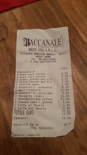 Read moreAvevo sentito parlare di Baccanale da molte persone e spinta dalla curiosità ho deciso di andarci per un aperitivo. Il locale è piccolo ma molto accogliente. Dispone sia di tavoli esterni che interni. Visto che era sabato e il locale era pieno abbiamo dovuto aspettare mezz'oretta prima che il primo tavolo da 4 fosse libero. I tavoli dove ci siamo seduti (all'esterno) sono riscaldati con delle lampade, che risolvono il problema del freddo. Passiamo all'aperitivo. Tutto molto buono. Abbiamo ordinato dei taglieri di antipasti misti: salumi, formaggi, bruschette, tutto accompagnato da un bicchiere di aperol spritz davvero ben fatto! Prezzi? Diciamo che siamo nella media calcolando che quello che abbiamo fatto era più un'apericena. In 4 abbiamo speso 60€ (15€ a testa). Ottimo servizio anche da parte del personale, tutti molto cordiali e preparati. Se avrò modo di tornare all'Eur credo proprio che mi fermerò nuovamente...