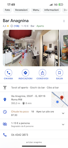 Read moreFaccio arrivare un pacco in questo bar, guardo su internet gli orari e risultava aperto con chiusura alle 18:00. Alle 17:35 vado per entrare e la porta era chiusa a chiave, da dentro, il proprietario o chi per lui dice che è chiuso, allora gli chiedo di poter fare solo una domanda e di poter ritirare il pacco. E lui risponde scocciatissimo: eh ma dovete venire prima, non è che non posso chiudere perché tu devi ritirare il pacco. Scortesia massima, se vuole chiudere prima cambiasse gli orari, perché il servizio deve essere offerto fino alle 18 come riportato sul...