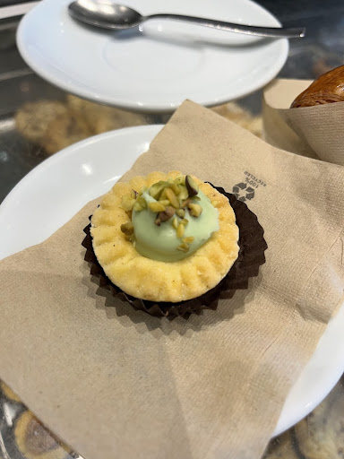 My friend and I decided to split a croissant and mini pistachio crostata, as well as a cappuccino. The cappuccino was phenomenal, with a perfect even ratio of espresso, steamed milk, and foam. The espresso was, of course, outstanding, and it didn't feel overly acidic or bitter despite being quite strong. The mini pistachio crostata was very cute, and I appreciated that they had this little two-bite version so that we could sample multiple things. It had a great pistachio flavor, and the crust was nicely buttery and crumbly. What I was most surprised by was, surprisingly, the croissant. it had a great honeycomb structure and was very light and airy, but also had the classic flakiness and slight crispiness that I look for in a great croissant. It was nice and buttery, but not overwhelmingly so -- a solid...