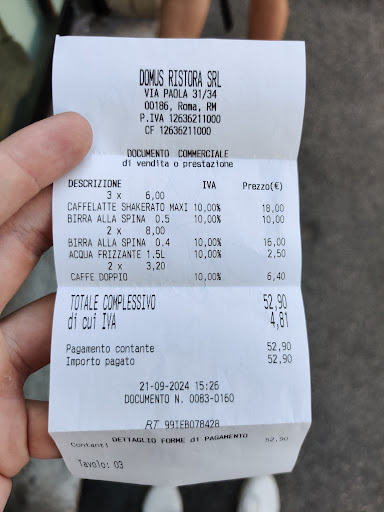 Very strange place. We were seated and basically ambushed by a waiter to have the “full English” breakfast as he assumed we were English (we are Irish) but that’s fine. He insisted we have the orange juice & coffee too & as we had been in a cafe by the Colosseum the previous day where we had an omelette, toast, orange juice & a coffee for €12 each in total, we assumed this was a similar set up as we basically never even got to look at the menu because the waiter was so hyper and insisted we would love this. In hindsight we should of course have looked at the menu and prices! The “full English” was an omelette with ham & cheese & one measly strip of bacon placed on top. It was accompanied by bread (not toast) drizzled in olive oil with raw cherry tomatoes and shredded iceberg lettuce. Bit odd but we shrugged it off. The omelette was pretty greasy but it was edible. One wasn’t cooked well enough and had a runny centre. The orange juice was thrust at us along with the coffees (mine in a broken mug) and admittedly the orange juice was very good. It was when we came to pay & that breakfast cos €77 total for 3 people. €24 alone for three orange juices. This is why I said we should have been given time to look at the menu as we would not have agreed to them but clearly the waiter is on commission. The place was not worth €77 at all. Whatever about the food, it was also insanely loud with the barista just banging cups the entire time. I just wouldn’t recommend and if you do plan on staying, at least tell the waiter to back off while you have a look at the menu so you’re not hoodwinked into the world’s most expensive...