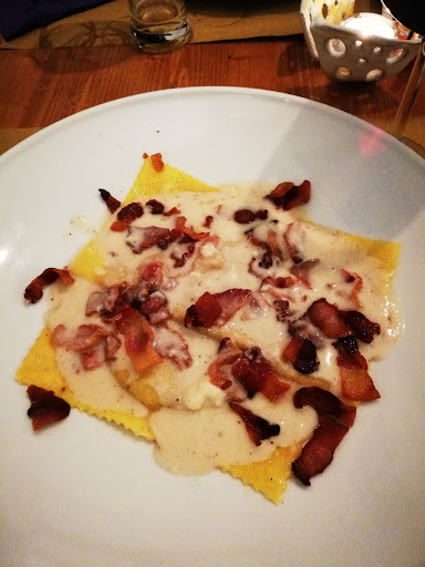 Read moreLa prima e l’ultima volta. Recensito con entusiasmo (5 stelle a go-go) da moltissimi ospiti, l’esperienza è stata molto al di sotto delle mie aspettative. Il locale non trasmette nulla di creativamente interessante ma il top sono i tovaglioli di carta fucsia e quelli arancione adagiati su tovagliatte di carta da pacco marrone: provate a immaginare. (🤨) Lasciamo perdere i quadri assurdi alle pareti, anche se può essere gusto personale. Gusto, appunto. Del cibo posso parlare di due antipasti di cui uno con la mostarda di pere troppo alcolica e dolciastra e il mio, che ho apprezzato come posso apprezzare qualunque cosa quando hai fame ma che non era niente di cucinato, praticamente una portata composta da pomodori sott’ollio, olive sott’olio e mozzarella di bufala, ognuno per i fatti propri nella propria ciotolina. Paccheri alla carbonara ricchissima, ma d’olio anche lei. Mentre il puledd pork era tanto affumicato da sembrare würstel di pollo cotto al barbecue. E con quesro carico d’olio arrivi a un dolce di cui puoi mangiarne solo due cucchiaini a testa: uno per la prova e l’altro perché vuoi dargli una seconda possibilità. Niente da fare. Una bonet deludente. Peccato, ma può...