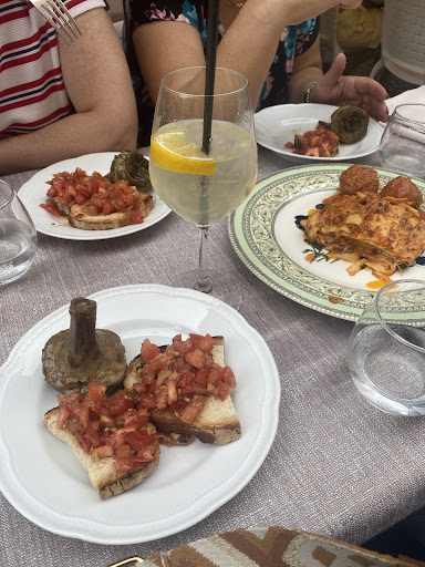 Lead in by a lovely gentleman, the menu prices seemed reasonable, however they offered items off the menu and then charged €5pp service that wasn’t mentioned anywhere. They had the hide to charge €8 for one artichoke; €6 for bruschetta al pomodoro (called it ‘antipasti’); €20 for a frozen lasagne and €20 for service. When delivering the bill, the waiter made a point of saying tip wasn’t included. When we questioned the service charge, we were told it was a tax, ridiculous. Those plates of ‘antipasti’ in the image were worth €14 according to the restaurant!