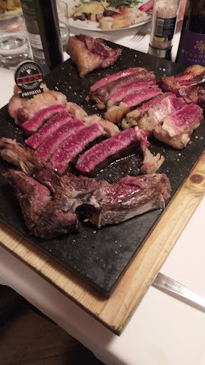 Un po’ fuori mano ma facile da trovare e con parcheggio. Arioso, semplice, essenziale, sa di nuovo, pulito e ha un bel banco di carne cruda dove scegliere il taglio che verrà pesato seduta stante e i cui prezzi sono chiaramente esposti in bacheca. Brace a vista e tanto personale gentile che assicura un servizio veloce. Alla mano e professionale il proprietario Massimiliano che cercherà di accontentare il cliente spiegando le qualità della carne e consigliandone la cottura. Eravamo 7 adulti e tre bambini e abbiamo ordinato un antipasto freddo: tagliere misto di 6 tipi di salumi più due formaggi da gustare con sfiziosa marmellata pere e zenzero (€ 18) e due antipasti caldi (€ 36): fagioli con spezzatino, tortino di melanzane, verdure pastellate e tondi supplì cacio e pepe (per questi caldi porzioni meno generose). Nei cestini di pane anche qualche delizioso crostino olio e origano. Al bancone ci siamo sbizzarriti con freschissima tartare da condire a piacimento con olio, sale, pepe o dolce mosto, ottima fiorentina di chianina (€ 48 al kg), succulenta bistecca texana (€ 65 al kg), squisita Angus danese (€ 38 al kg) e per i piccoli tenerissimi filetti nazionali (€ 15 l’uno). Come antipasti cicoria ripassata (€ 4), patate al forno di qualità ma forse con troppo olio (€ 4) e croccantissime chips (€ 4). Abbiamo pasteggiato con un intenso Cabernet Sauvignon Borgo Stajbech (€ 16), coca cola (€ 4,5 lt), acqua (€ 2) e ci siamo alzati da tavola visibilmente soddisfatti. Un posto che consiglio vivamente agli amanti della ciccia e...