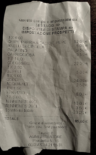 Come è andata: Ho prenotato un tavolo per otto persone per il dopo cena, a partire dalle 22:00. Appena arrivati, dopo l’attesa per ritirare la torta, ci siamo accomodati e hanno iniziato a prendere l’ordine perché “massimo alle 22:30 la cucina chiude”, fin qui tutto bene, anche se gli invitati non erano ancora arrivati. Dopo poco, ritorna la stessa ragazza dello staff che “non so se vi hanno informato, ma il locale chiude alle 00:00”, peccato che il mio compleanno avrei dovuto festeggiarlo a mezzanotte, per l’appunto avevo prenotato per il DOPOCENA. Era previsto il karaoke, ma “il ragazzo si è sentito male, infatti abbiamo chiamato e abbiamo avuto tante disdette per la serata”. Hanno chiamato TUTTI I TAVOLI, TRANNE IL NOSTRO (il locale era vuoto). Alla fine “per venirmi incontro” mi hanno fatto parlare con uno dei proprietari che mi ha detto che avrebbe allungato il turno ma massimo 00:20/00:30 dovevamo stare fuori. Tra l’altro insisteva chiedendomi con chi avessi parlato perché i proprietari erano lui e suo fratello (se mi leggi, la chiamata è del 03/04 alle 18:55 basta fare una ricerca 😉). Ovviamente, ci siamo dovuti ingurgitare il tutto e mezzi cocktail e cose da mangiare sono rimaste lì (insieme alla shopper gentilmente regalata 😒). Avevano detto che mi avrebbero impacchettato tutto e che avrei potuto portare via tutto il rimanente, ovviamente mai rivisto. Mi hanno anche portato la torta facendo cadere la candelina. (Ma sorvoliamo, può capitare). Ciliegina sulla torta: NON HANNO RILASCIATO SCONTRINO FISCALE, né copia del pagamento con il pos. Purtroppo me ne sono accorta solo una volta arrivata a casa perché dopo la serata rovinata, ha voluto pagare il mio ragazzo.