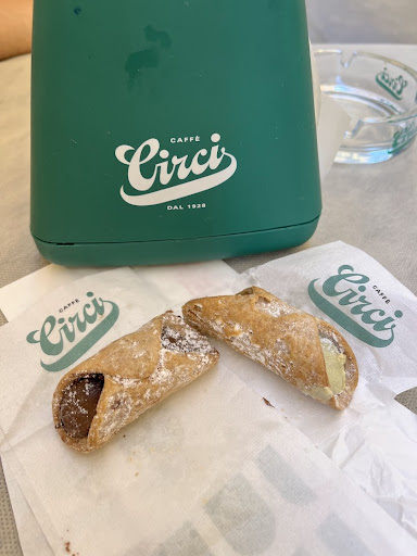 Lovely little Italian cafe and espresso bar! My friend and I randomly dropped by as we were walking through Rome on our hunt for cannolis, and we decided to pop our head into Caffe Circi. This cute little shop not only had cannolis for sale, but they also had multiple flavors...and mini versions so you could sample multiple without making yourself sick. We decided to get two mini cannolis, one filled with chocolate and the other with pistachio. Both were super tasty, although I think the richness of the dark chocolate won out in the end; the pistachio flavor was present, but not quite strong enough to fight through the sugar in the cream filling. The shell was a little bit too hard and overbaked, but I assume that was a result of their size -- the normal-sized cannolis were likely...