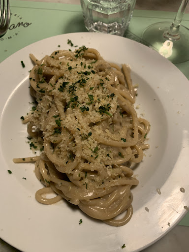 Abbiamo aspettato 45 minuti per dei fiori di zucca e altri piccoli antipasti, e quasi 50 per un piatto di pasta! Si dimenticano pure di servire le cose che hanno preparato sul bancone, tanto che una mia amica mi ha fatto notare che il suo bicchiere di vino bianco era stato dimenticato sul bancone per 15 minuti, infatti è arrivato caldo. Ci sono stati errori sin dalla preparazione dei cocktail fino alla fine della cena! Non puoi portarmi un tagliere da 5€ spacciandolo per quello da 12€. Avevamo espressamente chiesto un tagliere grande, invece ci siamo ritrovati con un tagliere della grandezza di una saponetta, e alla domanda, posta ben due volte, se fosse il tagliere da 12€, non ci hanno nemmeno saputo rispondere! Inoltre il mio piatto sotto era sporco di sugo che colava, (ma io avevo ordinato una carbonara!)