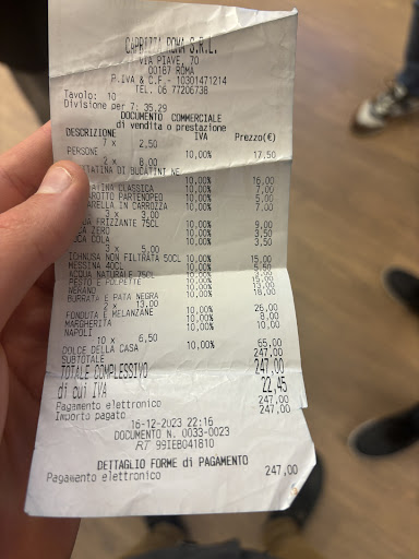 Read moreVisited Caprizza in Rome and was extremely disappointed by their billing practices. We were charged an exorbitant 65 euros for 10 Nutella croissants that appeared unrequested, implying they were complimentary. To make matters worse, we only received 4 of these croissants. This experience was not only misleading but felt like a deliberate attempt to exploit customers. Caution is advised to anyone dining here; watch out for unsolicited items added to your bill.