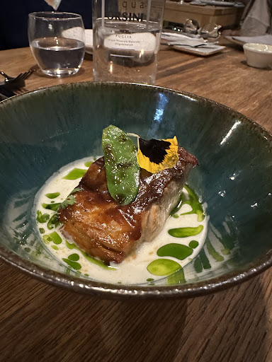 Here’s a rundown of what we had: The “carrot carrot” starter was fine. It didn’t blow me away, as I’ve had a nice carrot soup before, but it was very well done and I enjoyed it. A large bread board with olive oil came (8 slices of bread for 2 people). The bread was wonderful, and we were hungry to start, so we ate too much of it. At this point we noticed that no one had come to take our wine/drink order, which was odd. Thankfully we flagged down the sommelier and we ordered an excellent orange wine. The “duck in a pond,” or duck soup, was lovely. A dashi broth with bitter leafy greens and two slices of duck, it tasted homey and comforting. It was a bit of a challenge to eat with a spoon, I almost wanted to ask for chopsticks. The “pizza style” ravioli were so good, so comforting, and so huge! These were essentially large pizza bites inside very thick dough. Delicious but a meal on its own. I was stuffed after eating 3 out of 4. Then came the pork cheek. It was slow-cooked to perfection and very flavourful. I couldn’t bring myself to finish it as I was so full of food, I was getting physically uncomfortable. I felt awful for leaving it on the plate, I hate to waste such a gorgeous piece of meat.