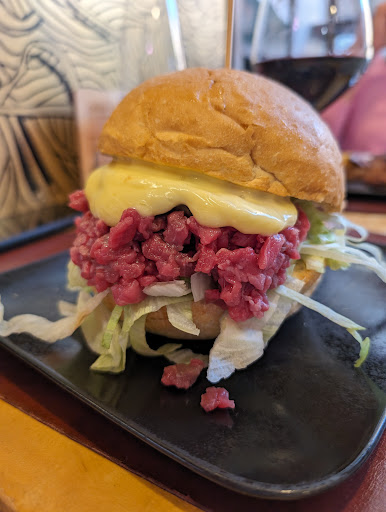 Worst meal and customer service I’ve had all holiday. Chose this restaurant as it was close to our hotel and looked appealing from the reviews, I found the menu confusing in the first instance and the greeting from the staff was unhelpful. I attempted to ask about the different food options however the waitress did not understand or attempt to get someone else. I chose one the ‘chef recommendations’ option, a veal burger, and ordered French fries. We were asked if still or sparkling water at first but weren’t asking for any other beverages or even given a menu. The burger was basically raw, it did not have any taste to it and neither did my partners steak he ordered. I tried to get at least one member of staff’s attention however they were just chatting by the entrance and didn’t look our way or ask if the meal was okay. In the end we had to get up and go and ask for our bill, to which they were very quick and ready to take our payment for the meal. When the waitress took the plates away she asked if it was any good (hardly touched it) and I tried to explain it was raw but she appeared not to understand and walk away. Would not recommend dining here...
