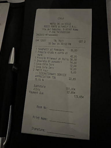 I usually don't waste time on a review, even if I'm disappointed with the place, but here I have to share my experience. The portions are small, the food is of average quality and very salty - price for one person 60-90⬠without alcohol, for what?? 𤯠The service is 1/5 for politeness, -4 for absolute tactlessness and inattention. I was told that they give bread for first gifts or sell, as usually happens in ā¬ā¬ā¬ā¬ places, but I refused and explained that I don't eat bread. In 2 minutes they brought me bread ššš while the waitress looks at me strangely and is surprised her, ok. They brought a menu but without drink cards, right, why carry them when the prices for a simple soda are 12 ā¬, this is at least 2 times more than on any terrace with a view of the city or the Colosseum. I can afford it for 100 euros, but when the status of the place is not such a low class. Even though I booked a room with a view of the city at night, my girlfriend and I sat with a view of people enjoying the view of the city. Cancellation booking -50⬠per person, -100⬠per two, keep in mind. And of course 15% of the cost is a tip, it is included in the bill how you can see in photo, but before paying you will be asked whether you want to leave this option or not. Thank you for asking, but what should I want to leave at least 1 cent for? Terrible, only this place in Rome where I am disappointed, but really so bad? They position themselves as a restaurant where *Dress code: smart casual or you will not be allowed in, but they themselves do not correspond to the category of "restaurant". You do not deserve to have my retro frozen Jordans there, so why should I wear my Ferragamo crocodile loafers? Crocodile with me will be sad here :(((. A commercial organization - yes, but not a restaurant. At the end, when I asked for the bill, I was told that I did not want dessert. They brought me grapes and some small desserts anyway. I say we donāt want it and from this the waitress exclaimed that it was a free gift. Maybe if I refuse the offer to order dessert and ask for the check, I do not want to eat sweets, and I want to leave? Thank you for your attention, but it should be included at least in the basic things, not when itās too much⦠I'm afraid to imagine the quality and attitude towards guests of the "Hotel de la Ville" in which this...