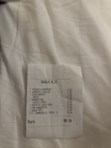 Read moreTourist trap be aware!! As soon as we entered the restaurant I immediately knew because the server kept being pushy with drinks. My mother In law wanted a glass of wine and the server said she needed to buy a whole bottle. Again, I’ve been living in Italy for many years and this is not true. You can buy 1 glass of wine without problem. Needles to say he gave us “ his recommendation” which was one of the most expensive bottles. When the time of ordering food came. Same thing with the server, extremely pushy about the most expensive thing in the menu with my in laws. The bread is an up charge ( yeah, you heard that right) not normal either. Once we were done eating I got up , walked to the counter and asked for the bill. (I tried to pay for all of us before my family tried) The server didn’t want to give me the bill. He said “ no, what if they want dessert and something else” I said “ they don’t want anything else, can I please have the bill” he kept insisting on not giving me the bill so I said: Fine , let me pay for this bill. If they want dessert I’ll pay for the other bill. Can I please have the bill. He finally gave it to me He was really aggravating so I went back to the table and gave it to my husband under the table. My husband got up and when he went to pay they kept asking him for tips. I know this is an unknown topic for tourist but in Italy there is no tip culture. You are not required to tip at all. Italians get offended if you ask them for tips. Why wouldn’t we be offended too? Oh I see , We are Americans and we are expected to tip when others don’t. Messed up.