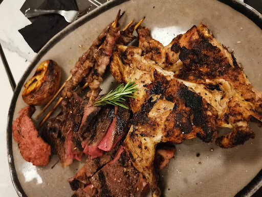 Ma la parte peggiore è arrivata con le grigliate di carne. Una gran grigliata, come la chiamano loro, da dividere per 4/5 persone sempre secondo loro era composta da: due salsiccette; un pezzo di carne rossa grande quanto la mia mano (credo pannicolo, vedendo il menu dal sito); due pezzi di carne bianca(suppongo galletto sempre vedendo dal sito); qualche arrosticino (arrivato freddo); mezza patata al cartoccio;
