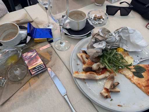 I’ve been in this restaurant 2 days In a row. The first night when me and my friend have arrived there everything was more than perfect. The staff was absolutely amazing, great friendly attitude, great serving and the food was the best we ate so far in Rome. One of the guys from the staff has given us a voucher for 1 free bottle of Prosecco for our next visit.. with this gift the issues started. However as we have liked so much the place and the food, the next day we decided to visit it again and to use our gift as well cuz we don’t know if we will ever visit Rome again. When we have shown to one of the guys from the previous night the voucher he was swearing his colleague in Italian for this free bottle and then he told us in English “ah you are here for the free bottle, ok ok” with quite a lot of sarcasm. Then he got annoyed of us from what I’ve seen that we wanted to order the food later but not with the drinks. Anyway, the bottle came and in our voucher was clearly written 1 FULL BOTTLE. The stuff came, gave us 4 champagne glasses and put 1 finger of Prosecco. Then suddenly this bottle has disappeared forever from our table. We didn’t see it anymore but we said ok, that’s fine, the gesture was important. Nobody knows why when they served us the champagne glasses, they served an orange juice for our child in same type of glass. Of course at one point the kid broke by mistake this glass and nobody came to clean it. The broken glass and million pieces of it were on our table till we left. At the beginning they didn’t see and I called them to clean it, they said ok and didn’t clean. Then we have ordered the food, they have served it, seen the glasses and served the food ON THEM! Is that how you threat your guests ?! The ashtray hasn’t been changed all the time and after we finished our food , the table again hasn’t been cleaned. But pictures are saying everything I guess … Also we have been charged with 4 Euro more for putting 2 tables one next to the other which is unacceptable as the tables have been arranged this way all the time and nobody re - arranged them specially for us. Anyway we won’t visit this place never anymore even if it’s the last food spot in Rome! I hope management reads this and give them at least penalty ( the date was 17th of...