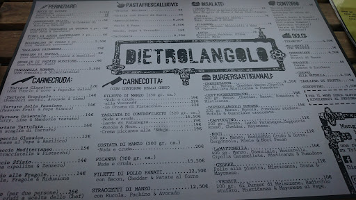 É la terza volta che ceno in questa bomboniera di ristorantino con la mia famiglia,amici e fidanzato. In tre giorni ho provato piatti tutti diversi tra di loro e tutti OTTIMI! La specialità a mio avviso, il fiore all'occhiello di DIETROLANGOLO é la squisita tartare di carne. Varietà di tartare tutte ottime! Super consigliata é quella al tartufo per chi ama sapori raffinati, e quella esotica dove la tenerezza della carne si confonde con la freschezza del lime, delle mandorle e del pepe nero, tutto accompagnato dal sale himalayano e spruzzi di senape che adornano il piatto d'ardesia. Gli antipastini sono fantastici,le sfoglie di patate rustiche con il formaggio cheddar, i fiori di zucca con caprino ( io non mangio il formaggio di capra ma questo é OTTIMO), la panzanella, il prosciutto di pata negra!!!!!! Insomma tutto troppo buono per essere vero! Questa sera ho preso una tagliata di carne alla Voronoff, insieme all'impiattamento come sempre stupendo, la carne era un vero burro, si scioglieva in bocca quanto era tenera, il mio amico ha preso una tagliata "nuda e cruda" (specialità del menù) ed entrambe erano deliziose. Nei giorni precedenti non ho potuto non prendere per due volte l'hamburger "baconburger": 200gr di carne con cipolla caramellata, bacon croccante,pomodoro e insalta! Bhe l'ho preso per due volte e potete capire il perché. La salsa a richiesta super consigliata é la maionese pepata fatta in casa! Ottimo é anche l'hamburger "Cappuccino" con patanegra, 200gr di carne😍 parliamo di dolci?! Bhe ottimi anche quelli!!!!!!!!!!!! Tutti fatti in casa!!!!! Ho preso la fantastica cheesecake all'oreo sempre di produzione propria impiattata su ardesia si presenta in modo rivisitata anch'essa; il tiramisù servito in bicchiere (sempre rivisitato) fatto con biscotti e non con savoiardi. Questa sera ho gustato le crepes alla nutella 😍😍😍😍. Rapporto qualità prezzo ottima! Tutto super meritato! Vi amo! Personale super disponibile, preparatissimo e gentilissimo. Super super...