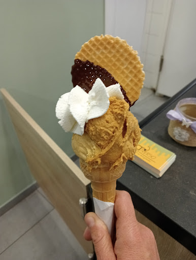 Ero di passaggio fuori zona,fermata attirata dalla parola magica 'artigianale'...che a volte non è attendibile,ma,visto che, per esperienza, ormai credo di riconoscere chi realmente lo sia, di solito entro a rendermi conto... e devo dire che non mi sono sbagliata...ho preso un bel cono (prezzo più che onesto, per due gusti: €2,20, altrimenti 2,70 per 3 gusti,etc)con pistacchio (forse un po'amaro ma ho scoperto recentemente essere la tostatura)e caramello salato ,con la sorpresa del cioccolato fuso nella punta,finora mai capitato!!(danno anche la cialda,come alcuni,ma intinta nel cioccolato... insomma i golosi sono soddisfatti,qui!!😅). Se dovessi trovare un difetto forse direi un po' lentini nel servire i vari clienti ma l'attesa viene poi ampiamente ripagata... quando ricapiterò in zona ci riandro' sicuro e l'ho già consigliata ad amici!Buon gelato...