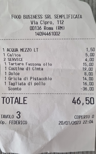 COSA SCEGLIERE Le fettuccine di gricia con pistacchio sono croccanti e ben condite...e superano brillantemente le nostre aspettative. Valida la Tartara di Fassona con Olio Bio (peccato per l'insalata della busta del supermercato). Eccellente il Filetto Cinta Senese, forse porzione leggermente striminzita. Bocciata la tagliata di pollo, decisamente stoppacciosa e accompagnata da pessime patate; ho gradito però la presenza della senape. Sorprendente la crema pasticcera della sbriciolata. 1/2 litro di acqua a 1,5€ va bene...