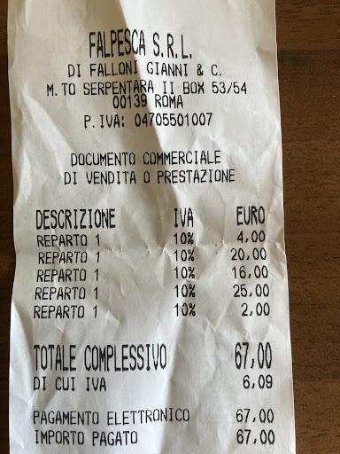 Read moreSiamo andati su consiglio di un amico. Location simpatica, situata all'interno di un mercato rionale. Personale molto disponibile e cortese, si è subito stabilita un'intesa che ci ha permesso di trascorrere una bella serata e mangiare delle portate, tutte a base di pesce, sicuramente non presentate da chef stellati ma, vi garantisco, buone, gustose e saporite. Un ricco antipasto di varie polpette di tonno o spigola, dei polpetti alla luciana, filetti di tonno con una gustosissima cipolla caramellata. I primi, sia gli scialatielli alla falpesca che gli gnocchetti, abbondavano di crostacei e frutti di mare. Non so, leggendo alcune recensioni molto negative, se è stata la nostra serata fortunata, di sicuro, in un mio prossimo ritorno a Roma, farò ancora visita a questo ristorante che ieri mi ha pienamente soddisfatto. Unica nota negativa potrebbe essere rappresentata dal fatto che essendo una ristopescheria sarebbero graditi dei prezzi più bassi, ma questa è una decisione che spetta solamente ai proprietari, a noi avventori la decisione di...