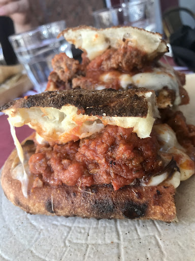 First, the bread. Pizza dough, aged for 72 hours for deep flavor, then baked into ciabatta-like sandwich loaves, just barely charred, that are shatteringly crispy on the outside and pillowy on the inside.