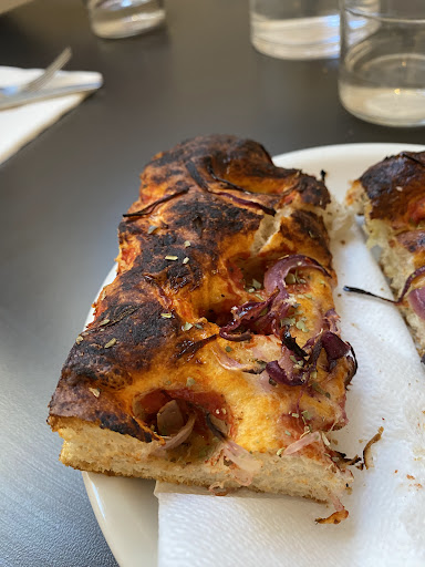 The focaccia dough was quite good, but there were very few onions, it was too cooked and very dry. Almost no onion flavor. I appreciate well-baked stuff, but the top was mostly burnt and too dry.