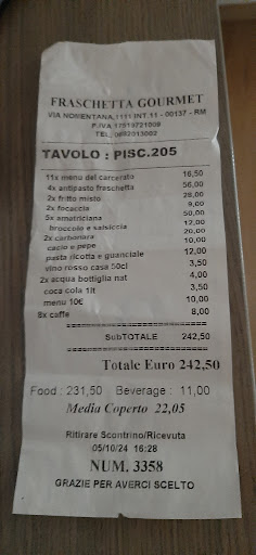 Read moreIeri sera sono stata a cena in questo ristorante e devo dire che è stata un'esperienza pessima. Dopo aver ordinato, ci vengono serviti gli antipasti (1 supplì e 5 polpettine fritte) più acqua e birra. Passati 40 minuti la cameriera (gentilissima) si scusa per il ritardo e ci offre una focaccia e 2 mezze fette di bruschetta. Passati altri 20 minuti sempre la cameriera, scusandosi, ci porta il contorno. Dopo altri 30 minuti arrivano le nostre ordinazioni ma alla mia amica che aveva ordinato la bistecca arriva una mezza braciola arrostita e a me arriva il galletto che ancora perdeva sangue dalla carne. Rimandiamo indietro l'ordinazione e il padrone del ristorante torna con il piatto della braciola cercando di convincere la mia amica a mangiarla. La mia amica rifiuta e chiede di nuovo la sua bistecca mentre io chiedo di cuocere meglio il galletto. PASSANO ALTRI 45 MINUTI e nessuno porta il cibo. A quel punto dopo esserci ingozzate di carboidrati e dopo un attesa inutile di 2 ore chiediamo il conto e il titolare del ristorante ha avuto persino il coraggio di inserire 3 euro di coperto. Alla fine, su insistenza della cameriera, che era veramente imbarazzata per l'accaduto, il titolare ci fa uno sconto di 5 euro (su un totale di 25 euro) dichiarando che era un "pagamento simbolico" in quanto asseriva che comunque qualcosa avevamo mangiato (tra l'altro ha poi confessato che il pezzo di carne in questione lo aveva tolto da un'altra grigliata per rifilarlo alla mia amica perché secondo lui siccome era una una donna sicuramente poteva andarle bene una porzione dimezzata). Indignate, deluse e con la serata rovinata (la mia amica aveva attraversato tutta Roma per venire a mangiare alla Fraschetta) siamo tornate a casa. Ovviamente, per quanto ci riguarda, non metteremo mai più piede on...