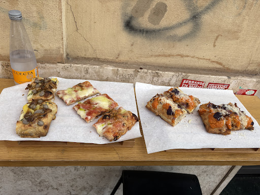 Read moreA volte ti capita di essere in trasferta per lavoro o piacere, magari hai sentito parlare bene di un locale della zona, finisce che ci fai una capatina e che dire, beato chi finisce da Frumentario! Ho visitato per la prima volta il locale il mese scorso, incuriosito dalla sua filosofia di pizza al taglio che non scende a compromessi di qualità, ma vuole restare popolare in termini di prezzo. Un modo di pensare la ristorazione sincero e che paga, e che ti ripaga in quanto cliente per aver dato loro fiducia, perché quando esci da quel piccolo locale in quel di Roma tutto ciò che pensi è che non vedi gia l'ora di tornare. Pizza al taglio superlativa, ce n'è davvero per tutti i gusti e anzi, se ciò dovesse procurarvi indecisione consiglio caldamente di affidarvi alla grande esperienza dello staff, sempre gentile e cordiale anche in orario di punta: un sentito ringraziamento va a Maria Laura per avermi introdotto alle varie proposte della giornata e, ovviamente, anche al buon Alessandro! Li per te, se sei interessato ti spiega nel dettaglio gli incredibili abbinamenti di ogni teglia, ti rifinisce la pizza al momento, se hai coraggio di affidarti completamente a lui (come ho scelto di fare io) ti organizza pure una sorta di menù degustazione coi best of del momento.E vai quindi di assoluto di funghi con caffè, ricordo di una insalata di pollo, sinfonia di melanzane a funghetto, patate viola con guanciale e pecorino ai tre latti, roast beef affumicato... E non osate uscire dal locale senza aver provato i fritti, che già solo quelli meriterebbero il pellegrinaggio! In definitiva, Frumentario ha un unico problema: non sta sotto casa mia. Forse è tutto sommato un bene, ma che devo dirvi, gia penso sognante alla mia prossima...