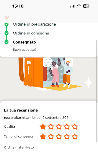 Rispondo da qui alla tua risposta Non è assolutamente vero perché io ho le chiamate fatte a voi dalle 00:48 dove un vostro collaboratore mi ha anche detto “meno male che avete chiamato che sennò dovevamo farlo noi ora vi metto in consegna però sappiate che ci vuole un ora per la consegna” io ho accettato …dopo che è passata l’ora ho richiamato e mi è stato detto che il fattorino era uscito ma che dovevo pazientare perché ci stava la pioggia nonostante io le abbia detto che sull’app di just eat mi compariva consegnato e la risposta è stata che era normale perché mette consegnato quando il prodotto esce dal locale…dopo altri 45 min ho richiamato e mi è stata data un altra versione ovvero che io non avevo risposto al telefono! Inventatevi altro perché su quest ordine avete sbagliato alla grande perché non vedo il motivo per il quale dopo insistenti mie telefonate per avere il mio ordine non dovevo rispondere al telefono! Siate onesti e chiedete scusa quando commettete qualche errore e mettetevi d’accordo tra di voi quando parlate con i clienti! Per la cronaca la mia recensione ci sta...