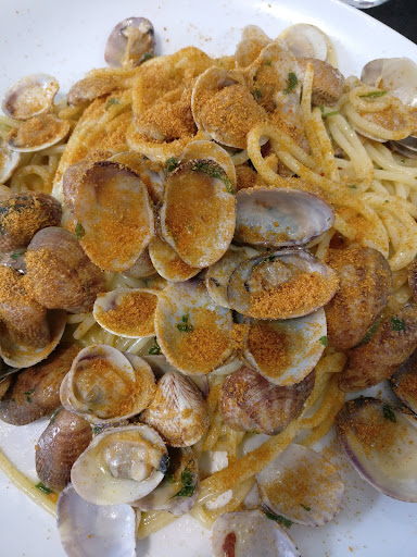 Food: the portions are really huge. Having said this we both ordered the specials of the day which meant that we didn't have any oversight of the prices. My linguine con vongole e bottarga felt it had double the amount of pasta that you usually get, the bottarga very generous although the clams were not that great. Some notes of over acidity which, when you make at home isn't there. (Pasta con le vongole is my favorite go to dish) The linguine with the catch of the day with the cherry tomatoes that my partner had was absolutely amazing. The fish was incredibly fresh, and it's very unusual to use an entire fish to make one single sauce. It was priced at 25€ which is on the high side (usually it's the price for sauces with lobsters) but it was well worth it - again an easy dish that could be for two people. With the premise that I kept on asking the staff to select a SMALL fish - just for taste it came out to be a 1kg of sole (sogliola/branzino) to much of my dismay, which one then does get the suspicious whether it was done on purpose (price is by weight). Yet: ingredients are fresh, the flavours are on the right spots.