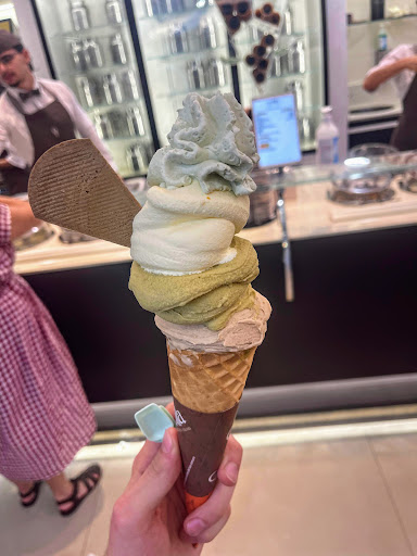 For ā¬4, I was able to get three flavors - but they went beyond this. I had a choice between milk or match melted chocolate to first be poured in the bottom of my cone which created an immensely rich and sweet treat once I'd finished eating the gelato itself, and complete with a topping of whipped cream which could also be pistachio flavored... all for ā¬4!