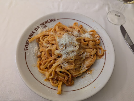 Small, family owned establishment that felt like home. Steps from the colosseum and across from the park, but tucked away and NOT a tourist-y place at all. Family owned with nana and papa sitting down chatting with the guests. Extremely reasonably priced, each dish was no more than €8-€15. Better than other restaurants in the area that are tourist traps and overpriced. It felt like you were in your Nani’s kitchen. Top notch service and authentic hand crafted tortellini and pasta. We finally found a restaurant that serves soft and fresh country white bread. They sent us home with half a loaf! The owner and family were so sweet and took care of us. There is a buffet style area If you want to try some of the local flavors including grilled veggies, oven roasted potatoes, full artichokes, mussels, rabbit, chicken and more. There are plenty of fresh, hot dishes to choose from on the menu. I was under the weather from so much traveling, and the tortellini en brodo was the perfect thing I needed. Please eat here, save yourself the hassle of fighting the tourist traps and also save...