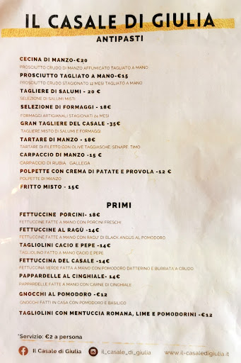 Abito a Roma, non molto lontano da qui, e sono anni che di tanto in tanto frequento questo locale, osservandone i vari cambiamenti. L’impressione è che da un anno o poco più il vero e proprio business si stia concentrando sugli eventi (matrimoni, comunioni e simili, con una ricettività che supera i 500 coperti), limitando molto la comune ristorazione alla carta, che è ora focalizzata su due settori: pizzeria e carne. Ne risulta un menù (che pubblico integralmente) molto limitato nel numero delle proposte, però passabile per chi è interessato alla pizzeria, e di sicurissimo interesse per gli amanti della carne.
