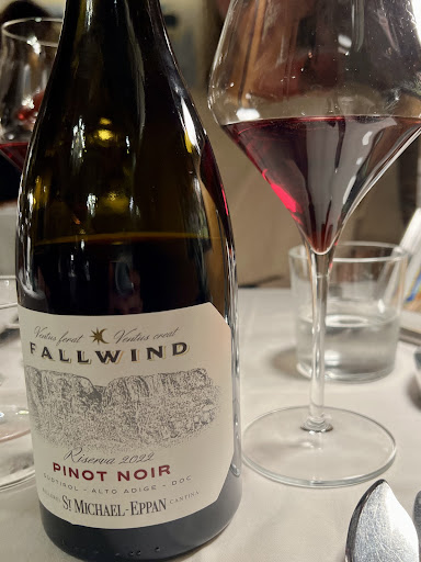 We shared a bottle of wine that was recommended based on our food choices and wine preference(we were looking for a red that would go well with seafood and lamb). The wine was a perfect elegant light red, an Alto Adige Pinot Noir, Fallwind, that went great with everything. We started with an antipasto special, a smoked salmon dish with burrata, it was very good and was seasoned perfectly. Then I had the grilled lamb dish while my partner had a seafood pasta dish and we shared some sides(potato and asparagus). It was all great and a good amount of food for us but not excessive.