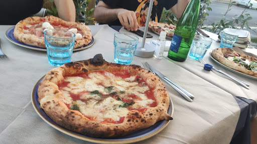 La pizza è arrivata celermente, cornicione a canotto come va di moda tra quelli che vogliono dimostrare di saper spingere l'aria verso il bordo e risparmiare sulla quantità di condimento, ma che personalmente, per quanto possa essere buono un impasto eviterei in quanto non aggiunge niente alla tipica pizza napoletana (se voglio mangiare il pane semplice opto per una panetteria), inoltre rende difficoltoso mangiarla in quanto pomodoro e formaggio filante si accumulano al centro appesantendo lo spicchio tagliato che già soffre di un diametro della pizza ridotto quando lo si va a piegare. Nel mio sfortunato caso cornicione anche in parte carbonizzato, poiché quando lo si fa gonfiare così tanto bastano pochi istanti di distrazione. Fondo della pizza "tigrato" per tutti i commensali, banale errore di esecuzione causato dall'eccesso di farina che rovina le proprietà organolettiche di una pizza che aveva un buon impasto e condimento saporito al punto giusto.