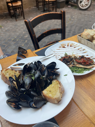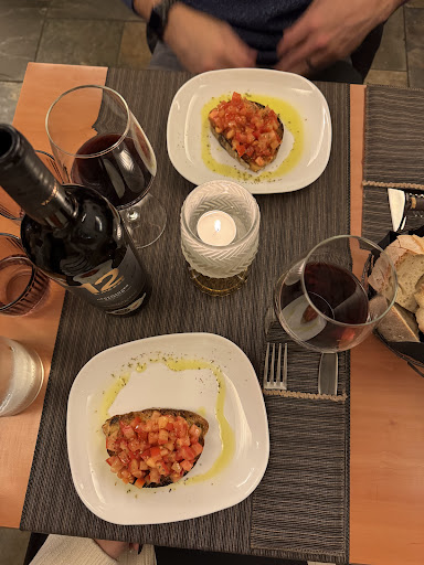 My husband and I ate here last year in October, and just knew we would be back. We are finally back in Rome and dined here on a Sunday night — the food, service, and atmosphere are AMAZING. We sat inside this year, which was lovely. Even when the tables fill up, it’s not overly loud. We ordered bruschette for antipasto, gricia for primi, and polpette ai funghi (a family recipe of the owner) for secondi. And of course ordered a bottle of wine - we tried the negroamaro salento based on recommendation and it was wonderful, a nice fuller bodied red without being overly dry. It paired well with our meal! Bruschette was perfect, it’s two good size pieces and perfect to share for two people. The gricia was unbelievable — the sauce was well balanced between the pecorino and pepper, and the guanciale was cooked to absolute perfection. The polpette were heavenly — you get three and they are slathered in a delicious mushroom sauce. We cleaned up both plates with our table bread at the end 🤤 We also tried the house dessert — they had several options, but we landed on tiramisu and it was so light and fluffy — an absolute perfect way to end the night!!