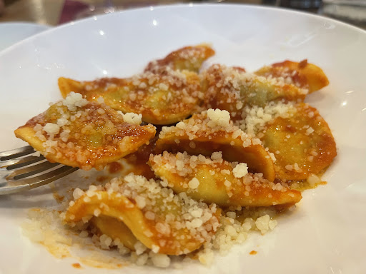 Il vino di colore rosso rubino intenso è discreto ma non eccezionale. Si sentono leggermente le note di ciliegia e al palato è corposo e pochi tannini ( 6 euro sono troppi). Carina l'idea di servire insieme al calice anche due ciotoline con olive snocciolate e lupini. Abbastanza velocemente ci viene portato il primo. La presentazione del piatto è buona ma le porzioni un po’ limitate. La pasta era cotta perfettamente e il condimento per equilibrato con i carciofi saporiti su tutto. In conclusione un ottimo piatto.