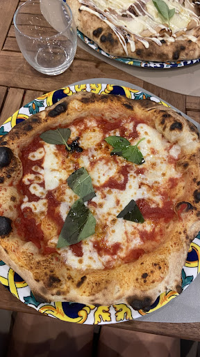 La pizza, portata principale del ristorante, è nella media. Preparano l'impasto napoletano ma, diversamente da quello che ci si aspetta, questo risulta più gommoso. Ho preso una pizza gourmet, quella che doveva essere una pizza con carbonara. Il diametro del piatto è nella media. Sicuramente gli ingredienti sono di qualità, ma la quantità e le modalità di cottura non erano delle migliori: ad esempio il guanciale troppo cotto e la provola veramente abbondante non aiutavano nella masticazione, già provata dall'impasto particolarmente gommoso, ne tantomeno nel gustare i sapori di una pizza che si indica come "gourmet". Era bellissima a vedersi, ma non sono riuscito a gustarmela. Eravamo in 4, abbiamo preso 4 pizze diverse, tutti abbiamo constatato l'impasto non dei migliori e un abuso degli ingredienti. Gli antipasti invece erano buoni e abbondanti, nonostante fossero per 2. Il servizio a me è sembrato poco professionale: bicchieri che cadevano, camerieri che si scontravano, tappi del vino che volavano, ordini dimenticati e i frigoriferi dei vini e dei dolci che si trovavano proprio dietro i tavoli, causando l'obbligato alzarsi dei clienti per permettere al cameriere di prendere, appunto, vini e dolci. Lo hanno fatto 5 volte in un'ora, non è stato piacevole per chi era seduto li. La location è veramente bella anche se una nota di disappunto vorrei farla sui bagni: sporchi, carta igienica finita e colore infelice: essendo di ceramica opaca nera infatti mostrano la cattiva educazione delle persone che vanno al bagno, soprattutto degli uomini, e la conseguente assenza di costante pulizia da parte del personale di servizio. Mi auguro che cresceranno, perché la qualità degli ingredienti c'è e secondo me anche la volontà di far bella figura. Dovrebbero però alzare la qualità del servizio e scegliere accuratamente impasto e ingredienti, considerando anche la spesa media prevista (30 euro a persona per 4 pizze, 2 antipasti, 3 birre, 2...