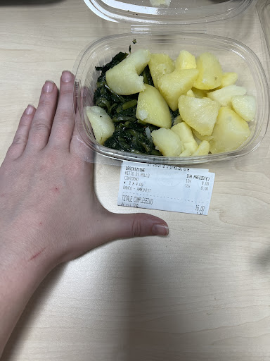 MODIFICA: Complimenti per la risposta, ha fatto una gran figura da strafott.ente, perché come vede non avevo mangiato nulla del piatto, porto sempre il pranzo da casa, mi piace e non mi pesa cucinare, ma oggi non avendolo ho chiesto ad un’altra persona di farmi il piacere e prendermi il pranzo e di certo non potevo dirvelo di persona, ripeto ve l avrei lasciate la. Vi ho scritto perché una settimana fa un contorno il doppio di questo è costato 5 euro, ma non è per i 3 euro è per la presa perché i vs prezzi non li capisco. Mi dispiace forse siete abituati a sentire solo belle cose, ma vanno presi anche gli appunti o le critiche che ricevete, e di certo la sua risposta è stata tutto tranne che elegante..sminuisce i suoi clienti, complimenti. Comunque visto che dubita della mia onestà metto la foto del contorno prima di essere aperto..visto che pensa sia stato toccato probabilmente vendete cose che sembrano già toccate e mangiate. Comunque la figura (pessima a mio avviso) l ha fatta doppia con la sua risposta..in allegato la foto per levarle la sete con il prosciutto! Non sono una purciara che mangia 2 volte con un pasto, ha proprio sbagliato persona! Io capisco tutto, ma questa “porzione” 8 euro mi sembra un qualcosa di paranormale!!! 8€ ? Sono 4 foglie di verdura e 1 patata, 8€! Sono esterrefatta..purtroppo me la sono fatta prendere da un’altro persona quindi non ho potuto lasciarla in cassa! Ma forse rivedrei un attimo i prezzi perché così è un furto senza...