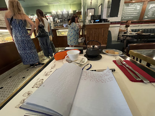 The banquette is the best part. From where I am seated near the door I watch them come and go. In packs of four. It’s empty, and it fills with 4 to 6. Four leave. Two more arrive. You catch my drift. The banquette is a safe refuge from the clackity clack of the espresso machine, The rising of Italian voices over the din, the deeper voice of said Waiter and his barista counterpart.