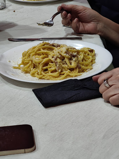 Ci siamo fermati a cena sabato sera visto che alloggiavamo in zona. Come primo consiglio vi esorto ad andare oltre l'aspetto esteriore del locale che lascia un po' a desiderare. In realtà l'ambiente dentro è discreto, soprattutto pulito. È una trattoria che propone cucina tipica romana, quindi la fanno da padrone trippa, coratella, fagioli con le cotiche, pasta ai sughi tradizionali (proposti anche con alcune varianti) serviti con porzioni abbondanti. Per i secondi piatti, che però non giudico perché non lomabbiamo presi, principalmente viene proposta carne alla griglia. C'è anche la pizza che, a giudicare dalla pasta che abbiamo potuto assaggiare con gli affettati, non dovrebbe essere male. La cucina non è male, non sto a dirvi che c'è di meglio, ma sicuramente c'è moooolto di peggio a Roma. Diciamo che tutto sommato ci tornerei. Il servizio è tipico della trattoria romana, quindi folcloristico, ma divertente e soprattutto efficente. Forse solo un po' lento. Prezzi un po' più alti rispetto alla media della zona, ma non mi è ben chiaro se il prezzo era quello per noi turisti (in 11 abbiamo pagato per alcuni antipasti da dividere un primo a testa, 4 bottiglie di vino, non ricordo l'acqua, 6 caffè, 7 amari e 2 dolci 32 euro a testa) o se sia lo stesso per tutti in quanto il menu c'è lo ha recitato il titolare e quindi non abbiamo visto o prezzi. Va da se, per un veneto 33 euro sono pochi, abituati ai nostri prezzi, ma sicuramente sono sopra la media di...