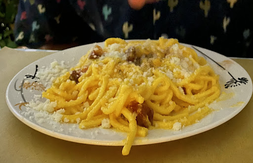 To say we were initially hesitant is an understatement. There are large recycling bins next to the tiny terrace, and inside isn’t especially inviting either (although good a/c). Still, we sat outside and immediately you could tell they care enormously that you feel welcome. Early for Italians (it was about 8pm), the waiter immediately set up our table, gave us a funky jar lamp, and lit a couple (very necessary) anti-mosquito spirals. There was no printed menu, but the waiter listed the dishes for us, even showing photos on the phone to try to explain to us what everything was. We ordered the carbonara and mint pesto pasta. It is by far the best pasta either of us has ever eaten.