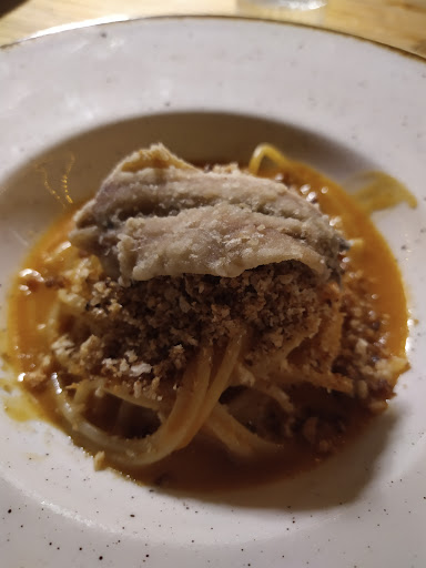 Per i primi, abbiamo assaggiato gli spaghetti con le vongole e lo spaghettino Felicetti con burro, alici e limone fermentato. Entrambi i piatti erano ben preparati e gustosi. Il cubotto di tonno croccante con puntarelle e salsa ajoli è stato un secondo piatto eccellente, con una perfetta combinazione di consistenze e sapori.