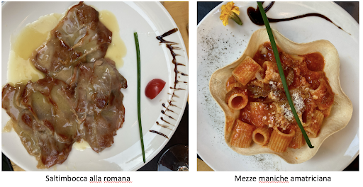 Postscript: We returned to Tavernetta 48 on our last evening in Rome. It rose to the occasion. Two of us ordered Saltimbocca alla romana and one ordered mezze maniche amatriciana, as shown below. Saltimbocca is a dish I used to make regularly. It has a base of thin veal cutlets, garnished with sage, and topped with prosciutto. It is dredged lightly in flour and sautéed in butter/oil and finished with a sauce of white wine and perhaps some stock. Both dishes were attractively presented and a delicious conclusion to our...