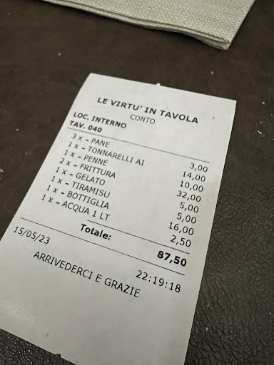 Read moreMy recent visit to Le virtù in tavola left me impressed with their delicious pasta and perfectly fried calamari. The restaurant offers a diverse selection of wines at reasonable prices, making it even more appealing. The pasta dishes I tried were truly outstanding. Each bite was filled with rich flavors and perfectly cooked al dente pasta. The calamari was crispy on the outside and tender on the inside, a true delight for seafood lovers. What I particularly appreciated about Le virtù in tavola was their extensive wine list. It showcased a variety of options to complement the meal, and the prices were quite reasonable compared to other establishments. The staff was also knowledgeable and provided excellent recommendations. Although I had a great experience overall, I am giving it four stars because the service was slightly slow during peak hours. However, the quality of the food and the value for money make it a worthwhile dining destination. If you're in search of good pasta, fried calamari, and a great selection of reasonably priced wines, I highly recommend visiting Le virtù in tavola. It's a culinary gem that...