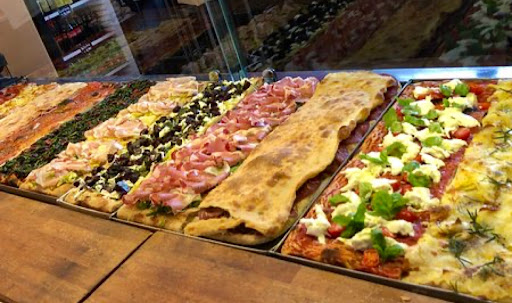 Cibo: Assolutamente eccezionale. Fuori dai canoni tradizionali, forse ho capito male, ma ritornerò per accertarmene. Le pizze vendute sono, credo, tutte ripiene, oserei dire gourmet. Gli ingredienti sono inaspettati, con soluzioni a volte ambigue ma di una bontà stellare! Ogni cosa che ho assaporato, anche la semplice pizza con la mortadella, mi ha lasciato basito, felice e incredulo sia per la qualità che per la quantità di ripieno. Ho provato la pizza ripiena con hamburger e un'altra con pomodori, che credo sia la loro rivisitazione della margherita. Ripeto, fantastica. Recensire una pizzeria a taglio non è semplice, ma questa lo merita.