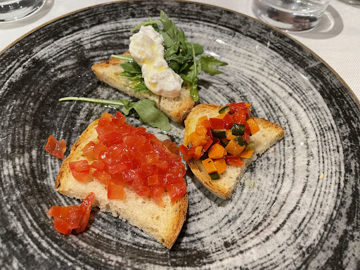 Read moreCi aspettavamo di meglio dalle precedenti recensioni. Abbiamo preso un tris di bruschette che era in realtà un tris di mini fettine di pane piccole, fine e fredde con inoltre sopra su una un misto di verdurine a dadini gelate, una con mini dadini di pomodorini freddi e l’ultima con 4 foglie di rucola e un cucchiaino di stracciatella… tutto gelato e tutto micro alla modica cifra di 6€. Sarebbe meglio a questa cifra fare 2 belle fette di pane bruscato, croccante e caldo con sopra dei veri condimenti da bruschetta… Poi abbiamo preso una entrecote di manzo con patate al forno che però era piena di nervi e grasso e di patate c’era il ricordo su 5 fettine di patata (20euro) e un primo piatto che era un tonnarello di terra, per fortuna almeno quello era buono e ben fatto.