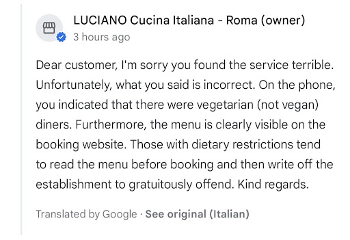 To be clear, my issue was not with the lack of vegan options, but with the service. There are similar reviews...