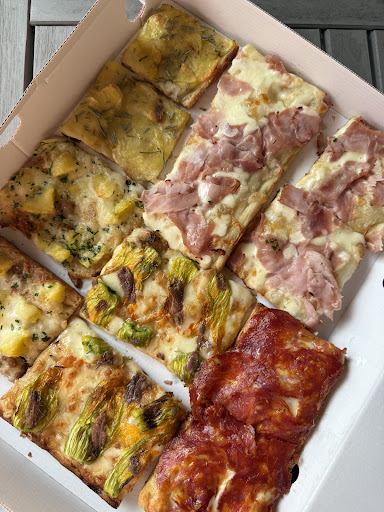Eccellenza di ingredienti utilizzati in impasto altamente digeribile e con la sapienza di chi mette passione nel proprio lavoro . Ti viene voglia di assaggiare ogni tipo ma poi risulta impossibile per quanto è buona e piena di ingredienti aver la capacità di godersela realmente. Quindi consiglio di ripetere l'esperienza di acquisto piu volte al fine di potersi godere realmente il sapore artigiano di ogni composizione. Il servizio è gentile e veloce, VALERIO il proprietario dimostra la sua capacità di interazione con la clientela anche mentre si dà fare a preparare nuove teglie . Personalmente vi dico in un quadrato di quella con la mortadella rimani stupito non solo dalla croccantezza dell'impasto ma anche dalla quantità di mortadella fresca e buona utilizzata per condirla . Abbiamo acquistato con la fame della serata dopo il mare e con l'acquolina che ti viene quando guardi i vari tipi sul bancone... Beh difficile apprezzarla pienamente perche i condimenti sono veramente generosi ... Quindi ripeto è un luogo in cui val la pena andare piu volte al fine di potersi godere quante piu varietà possibili . Se dovete fare acquisti all'eurospin avete il parcheggio tranquillo a pochi metri dal locale, Insomma provate il fascino di ingredienti di qualità e scelti per il condimenti e fatevi trasportare dal gusto di un impasto veramente ottimo e...