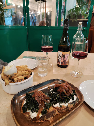 Entrare da Mangiadischi è come fare un salto in un’altra dimensione. Ogni dettaglio è curato: dai lampadari alle piante appese, dagli adesivi all’ingresso ai vini a vista, dalle pareti ai tavoli e sedie retrò, fino ai bagni no gender. Ogni angolo del locale riflette un’anima ribelle e accogliente allo stesso tempo, con la cucina a vista e un bancone che ti fa subito sentire parte di una grande famiglia, come se ci fossi sempre stato. Ma è l’atmosfera a fare la vera differenza: intima, calorosa, di quelle che ti fanno pensare di essere in un rifugio per intenditori, lontano dagli occhi di chi non sa apprezzare.