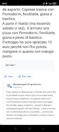 Mi dispiace, ma da (ormai ex)cliente affezionata, devo constatare che purtroppo il livello si è abbassato di tanto. Non è la prima volta che ritardano una consegna, ma stavolta siamo arrivati ad un ora di attesa e di telefonate di sollecito....pizze arrivate più piccole, fredde, mezze bruciate da un lato e mezze crude dall'altro. Ovviamente non ordinerò più da loro, oltre al fatto che la qualità della pizza è deteriorata, soprattutto per il mancato avviso relativo al ritardo e senza avere nemmeno l'accortezza di farci uno sconto o di offrire un qualcosa in più rispetto all'ordine come succede in tutti i ristoranti del mondo. Sono miei compaesani, ma , evidentemente, la lontananza da Napoli cambia parecchio le persone...peccato... MODIFICA ALLA RECENSIONE IN RISPOSTA AL PROPRIETARIO. Ciao. Naturalmente apprezzo le tue scuse, ma volevo dirti che sono vostra cliente da un pò di tempo e ho anche recensito la vostra pizzeria in maniera estremamente positiva e ho consigliato a tutti gli amici di venire da voi e/o ordinare a domicilio. Purtroppo è già da un pò che i ritardi sulla consegna e gli errori vanno avanti, così come l'abbassamento della qualità della pizza. Ho compreso e ho continuato ad ordinare. Ma ieri, a dirti la verità, ci sono rimasta male , perché non solo non sino stata avvertita del ritardo, ma alla mie due telefonate di sollecito, mi è stato detto 10-15 minuti al massimo e arriva, cosa non successa . Morale della favola pizze arrivate dopo un ora, fredde , mezze crude, mezze bruciate e rimpicciolite, senza nè scuse nè altro. Ti ringrazio e apprezzo l'offerta del buono, ma declino l'invito. Avrei preferito una vostra attenzione ieri, e non dopo la recensione, visto proprio il fatto che sono vostra cliente da un bel.pò e non da qualche mese. Ti auguro buon lavoro e una...