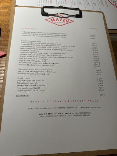 Read moreDid we find ourselves back in Brooklyn? That’s the vibes Mazzo is giving with the vinyl and exposed kitchen. We both enjoyed the rosso and got a second glass of that. In terms of food, we wish they had the famous tripe available to order! Too bad. I believe their menu changes often which is why a lot of the photos from google review were t available to order. We got the bbq’ed mortadella to share (much larger than expected and prob would not recommend since it wasn’t that unique and took up a lot of stomach space. Next we got the wagon wheels pasta which was decent for me but my husband enjoyed very much. Then we shared the roasted lettuce for some veggies - mediocre and very filling due to the tahini sauce. Lastly, we got the pork neck steak which was very delicious 10/10 recommend. Wish we could try the tripe or the diaphragm on the next trip. Overall pretty good meal, but we could have ordered better - bonus points for being able to try something different in Rome rather than just the ubiquitous carbonara and...